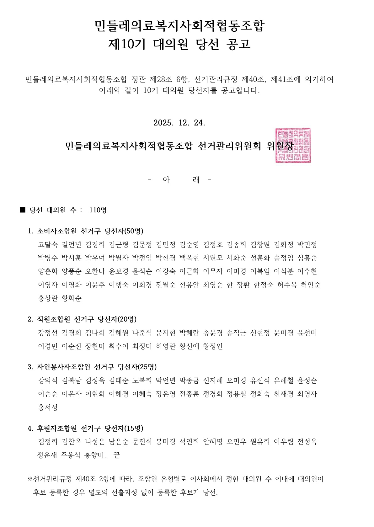 제10기 대의원 당선 공고
